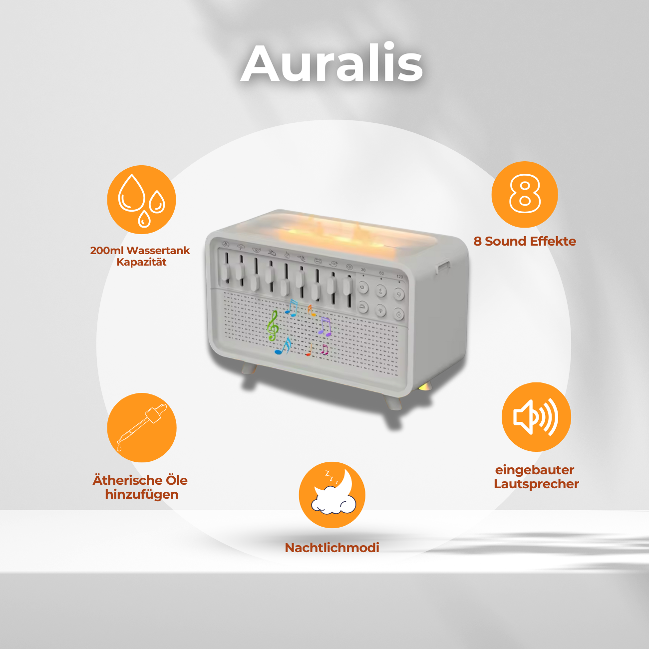 Mit 8 entspannenden Soundeffekten, einem hochwertigen, integrierten Lautsprecher und flüsterleisem Nebelbetrieb entsteht ein ganzheitliches Wohlfühl-Erlebnis.