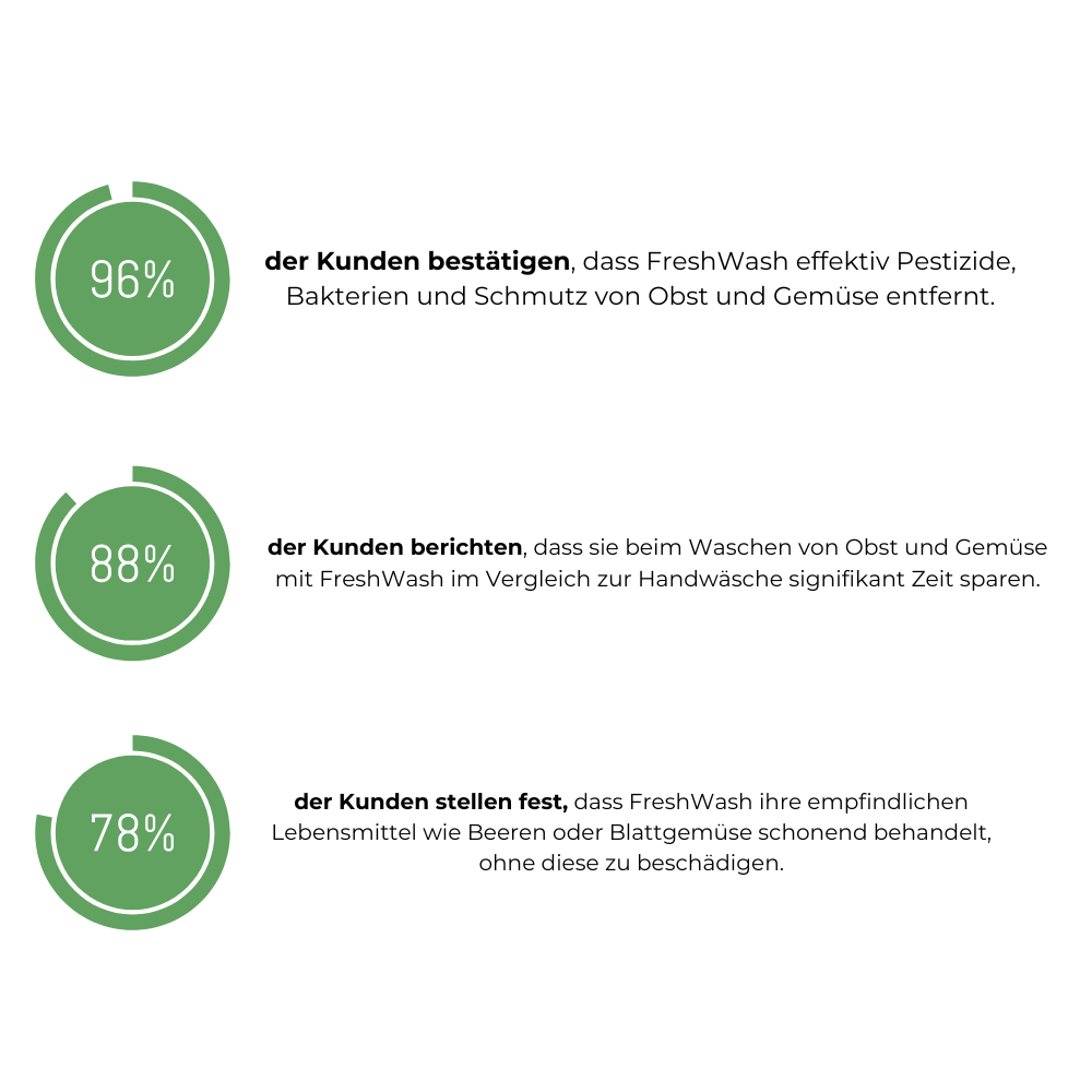 Mit 96% Zufriedenheit bei der Reinigung, 88% Zeitersparnis und 78% Weiterempfehlung ist FreshWash die perfekte Wahl für alle, die schnell und sicher Obst und Gemüse reinigen möchten – und das bei minimalem Wasserverbrauch!