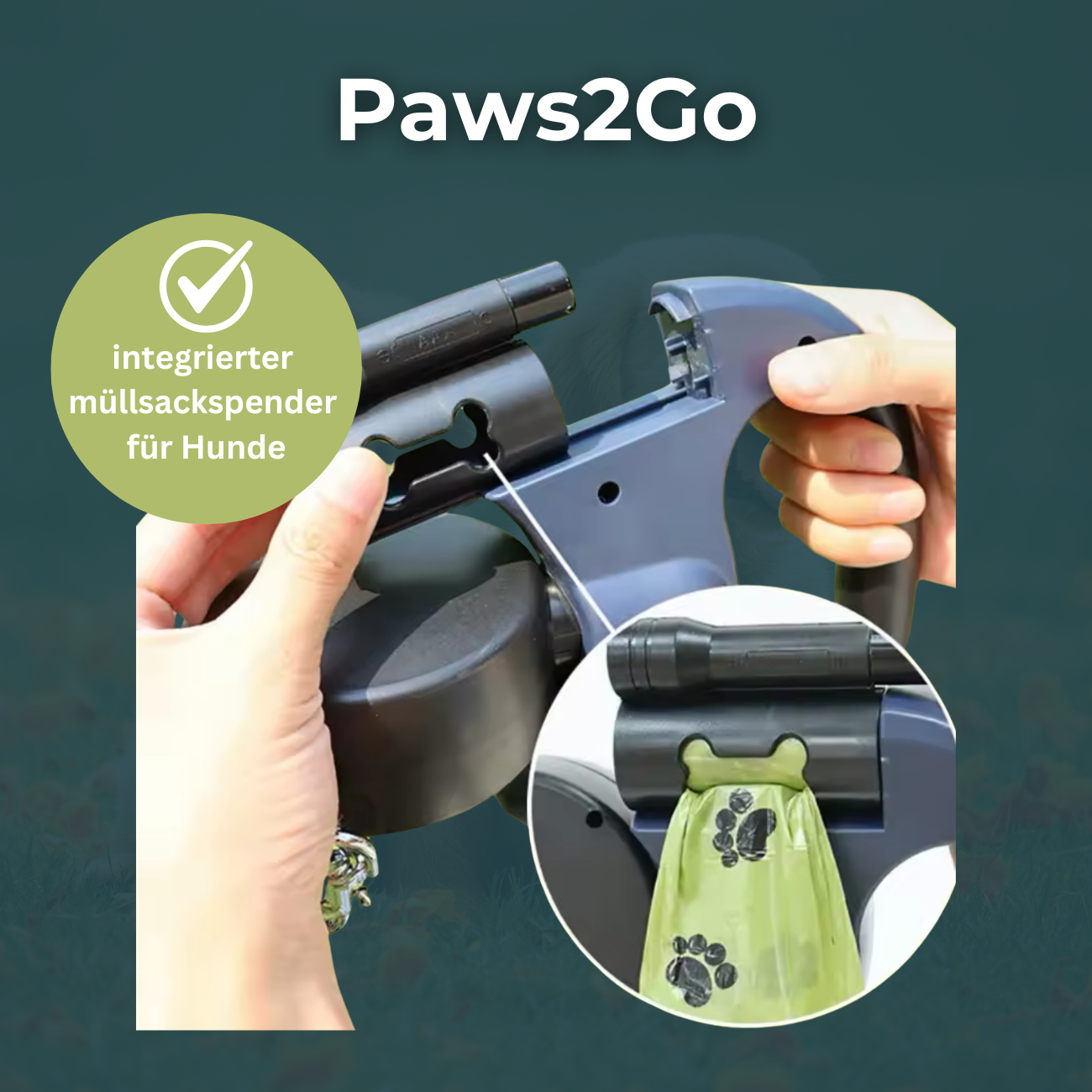 Die Paws2Go Hundeleine kommt mit einem integrierten Müllsackspender für Hunde, sodass Sie immer vorbereitet sind, um Hundekot schnell und hygienisch zu entsorgen.