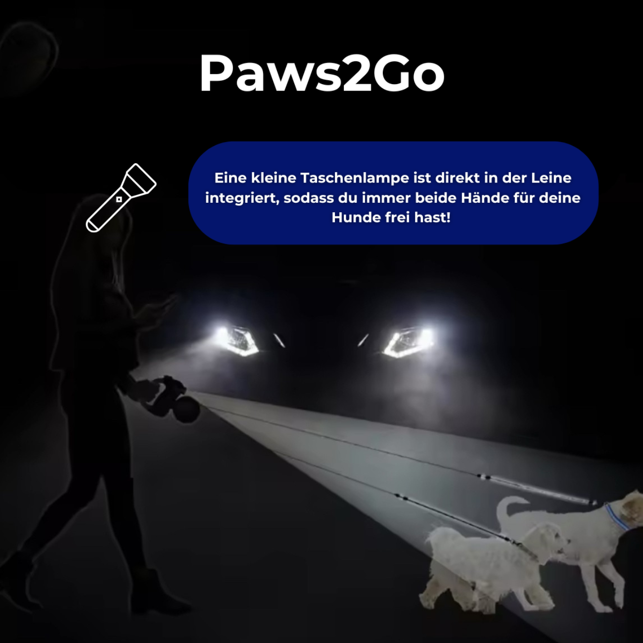 Die Paws2Go Hundeleine ist mit einer praktischen integrierten Taschenlampe ausgestattet, die dir auch bei Spaziergängen in der Dämmerung oder Dunkelheit mehr Sicherheit und Sichtbarkeit bietet.