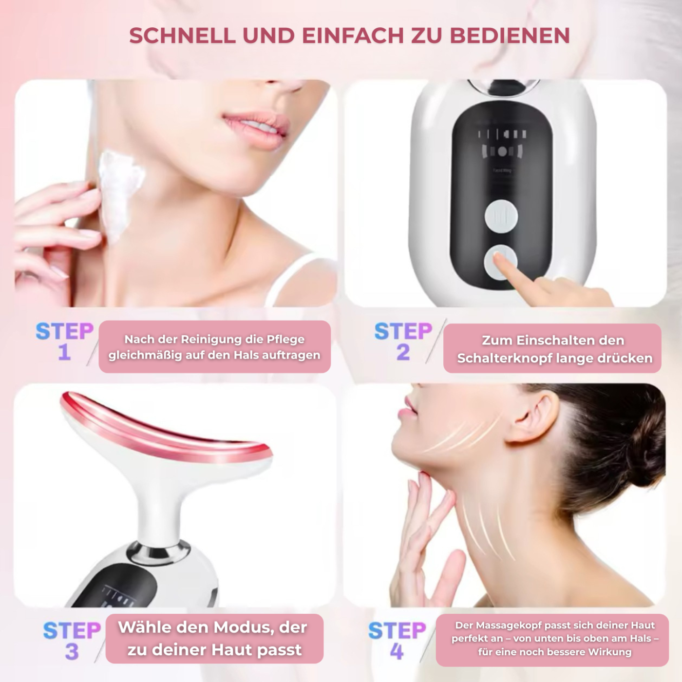Bereits nach vier Wochen regelmäßiger Anwendung berichten Nutzerinnen von sichtbar strafferer Haut, einer definierten Kieferlinie und einem frischeren, ebenmäßigeren Teint.